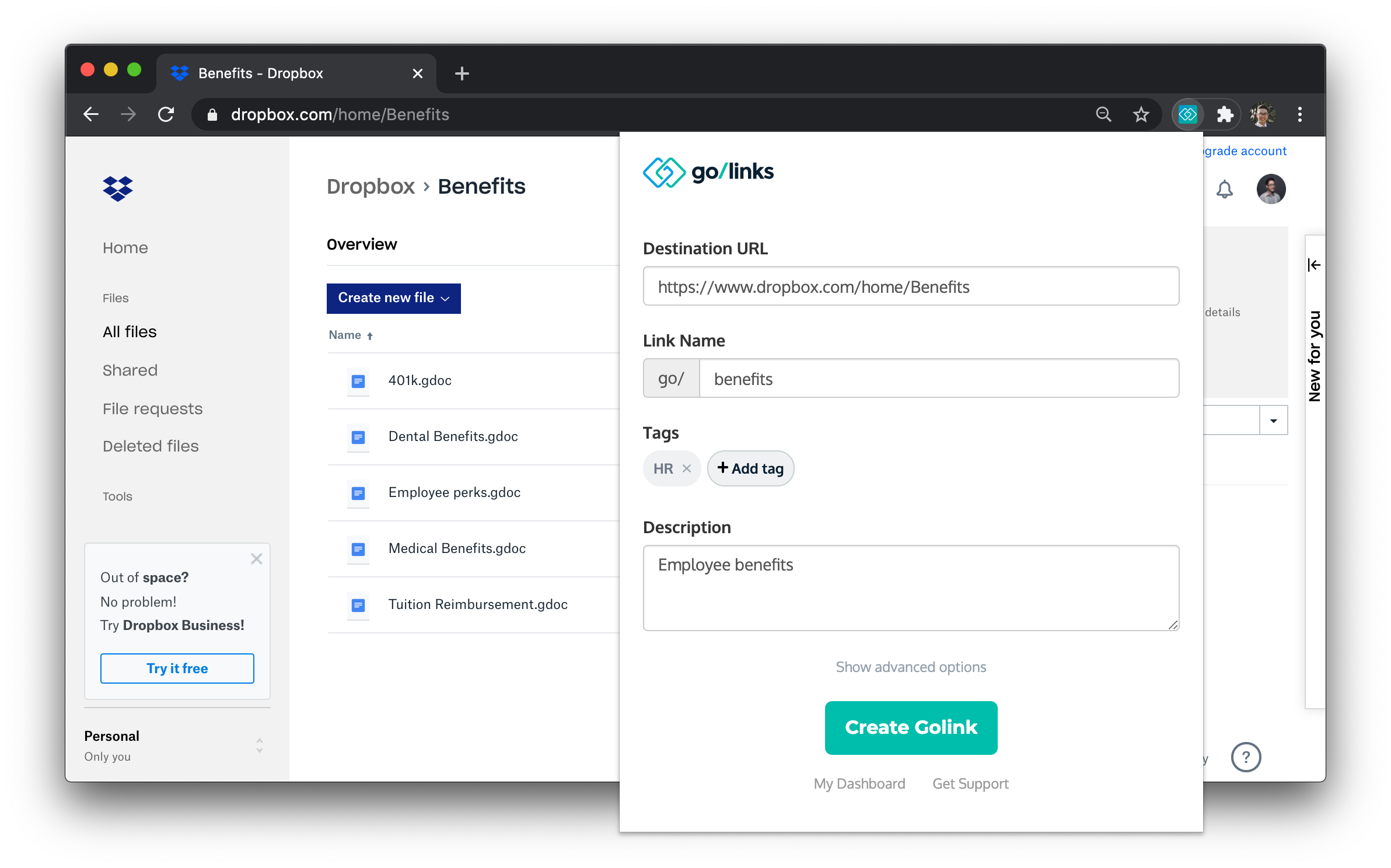 • Seamless integration: GoLinks seamlessly integrates with your existing Dropbox workflow. You can create go links directly from within Dropbox, ensuring a smooth transition and enhancing your overall experience.