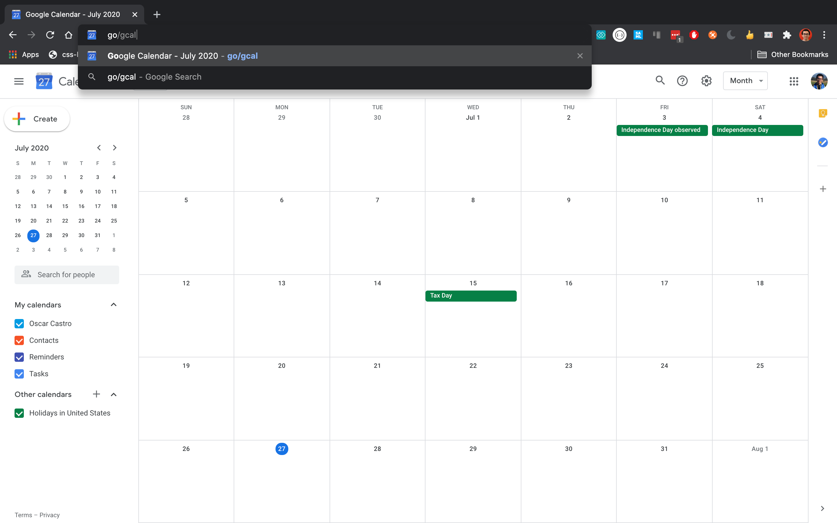 • Fast navigation to Google Calendar landing page - When your organization is using golinks, you can use go/cal or even go/c (depending on how the golink is set up) to quickly navigate to your main calendar page.